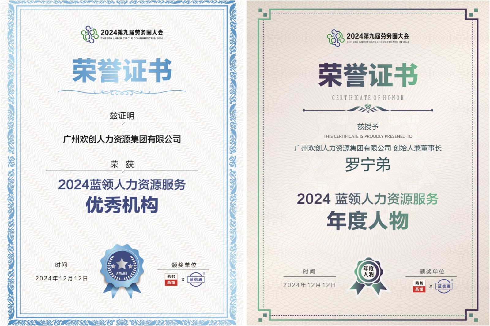 会上隆重揭晓了2024蓝领人力资源服务年度评选获奖名单,欢创集团荣获“2024蓝领人力资源服务优秀机构”,集团董事长罗宁弟荣获“2024蓝领人力资源服务年度人物”。欢创以蓝领用工起家,凭借其深厚的行业经验和对市场需求的敏锐洞察,经历十多年的行业沉淀,已成为人力资源服务领域的佼佼者。欢创集团不仅在传统的蓝领招聘领域深耕细作,更是紧跟时代步伐,聚焦新蓝领市场,通过技术创新和服务升级,为现代企业提供更加精准高效的灵活用工解决方案。此殊荣,为欢创在整个人力资源领域的综合实力和创新影响力添上了荣誉一笔。