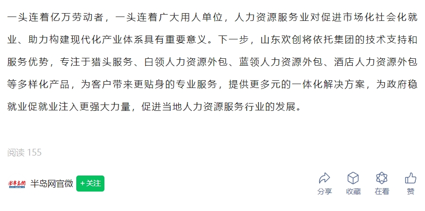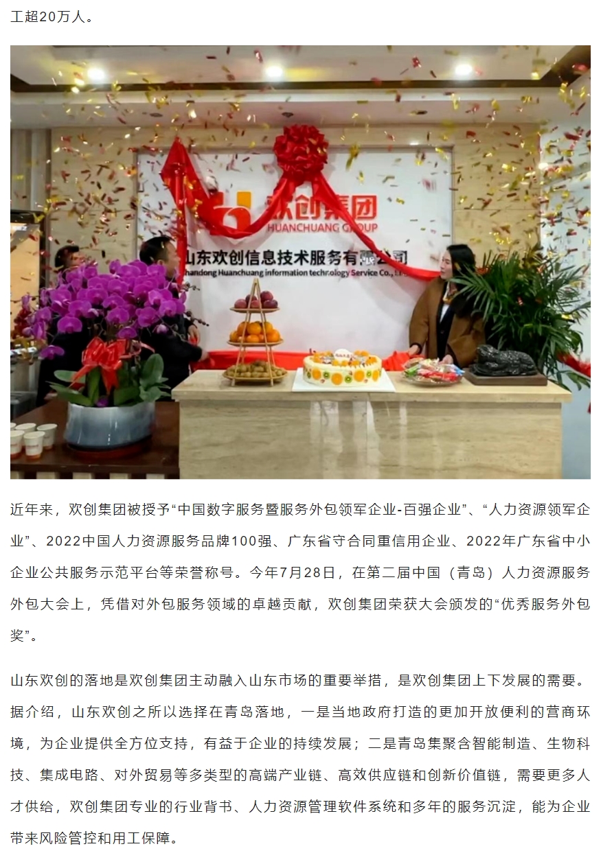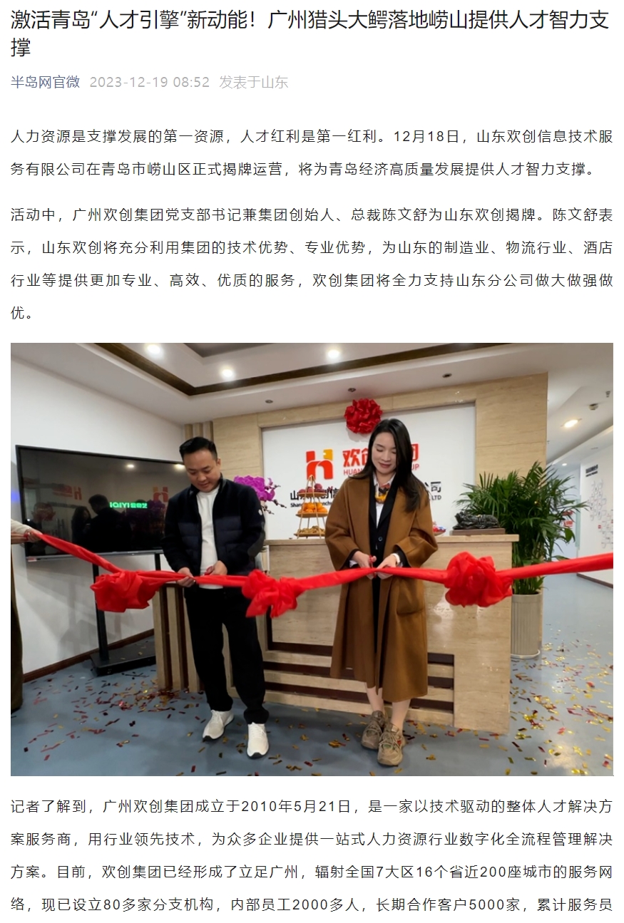 半岛网:激活青岛“人才引擎”新动能!山东欢创信息技术服务有限公司正式揭牌运营